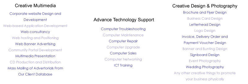 | Once you are ready to embark on something new and exciting, we are there to support you. In line with our Creative Multimedia is our Advanced Technology Support, a service to keep you move forward in your businesses. This service is designed to troubleshoot, maintain, repair and upgrade any computer related problems including the dreaded virus attacks. We also consult on networking, be it at home or at your office. Part of our effort to support the usage of advanced technology tools is to give ICT training to you so that you can take advantage if it to boost your business. Our ICT training includes basic computer training, Internet training, Content Management System Development Training, Microsoft Application Training and a lot more. Just tell us what you need and we'll deliver! |